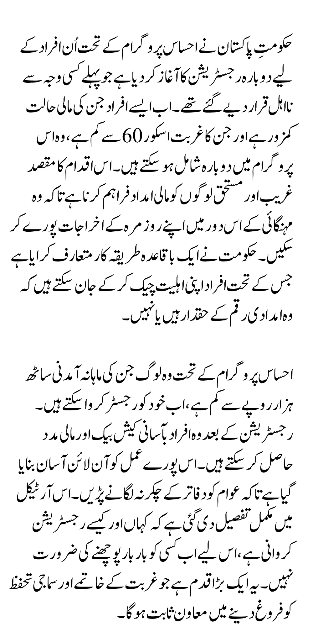 Under the Ehsaas Program, those people whose monthly income is less than sixty thousand rupees can now register themselves. After registration, those people can easily get cashback and financial assistance. This entire process has been made easy online so that the public does not have to go to offices. This article has given complete details on where and how to register, so now no one needs to ask again and again. This is a big step that will help in poverty alleviation and promotion of social security.