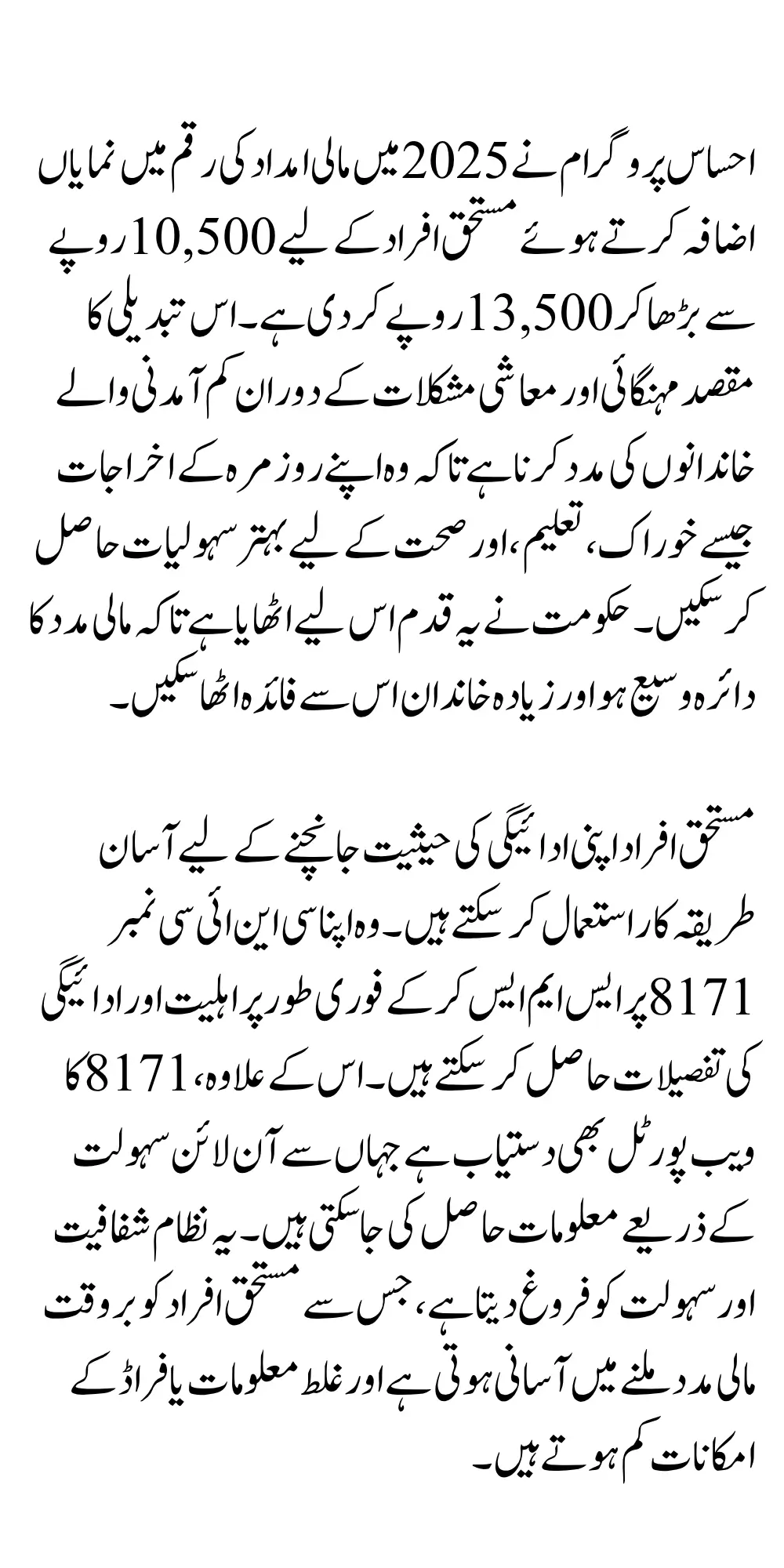 The Ehsaas program has significantly increased the amount of financial assistance from Rs. 10,500 to Rs. 13,500 for eligible persons in 2025 The aim of this change is to help low-income families during times of inflation and economic hardship so that they can get better facilities for their daily expenses such as food education and health the government has taken this step so that the scope of financial assistance is wider and more families can benefit from it.