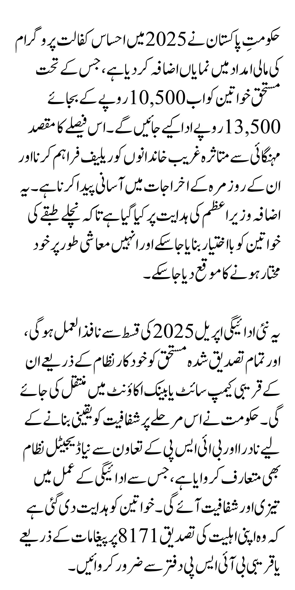 The Government of Pakistan has significantly increased the financial assistance of the Ehsaas Kafalat Program in 2025, under which eligible women will now be paid Rs. 13,500 instead of Rs. 10,500. The decision aims to provide relief to poor families affected by inflation and ease their daily expenses. This increase has been made on the instructions of the Prime Minister to empower lower class women and give them an opportunity to become economically independent.