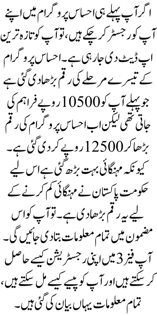 If you have already registered yourself in the Ehsaas program, you are being given the latest update. The amount of phase three of the Ehsaas program has been increased which was earlier provided to you by Rs.10500 but now the amount of the Ehsaas program has been increased to Rs.12500.