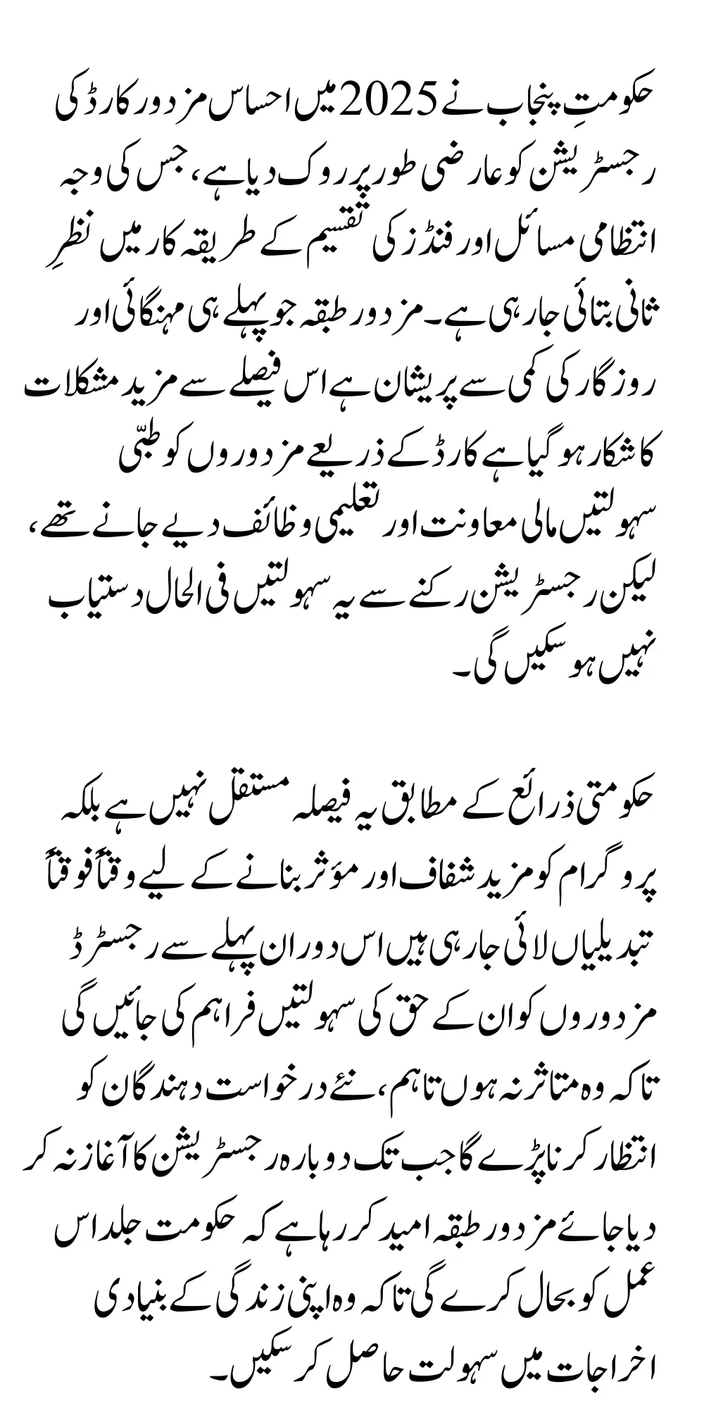 Punjab government has temporarily stopped the registration of Ehsaas Mazdoor Card in 2025 citing administrative issues and a review of the method of distribution of funds the labor community which is already worried about inflation and lack of employment has been further affected by this decision the workers were supposed to be provided with medical facilities financial assistance and educational scholarships through the card, but due to the suspension of registration these facilities will not be available for the time being.