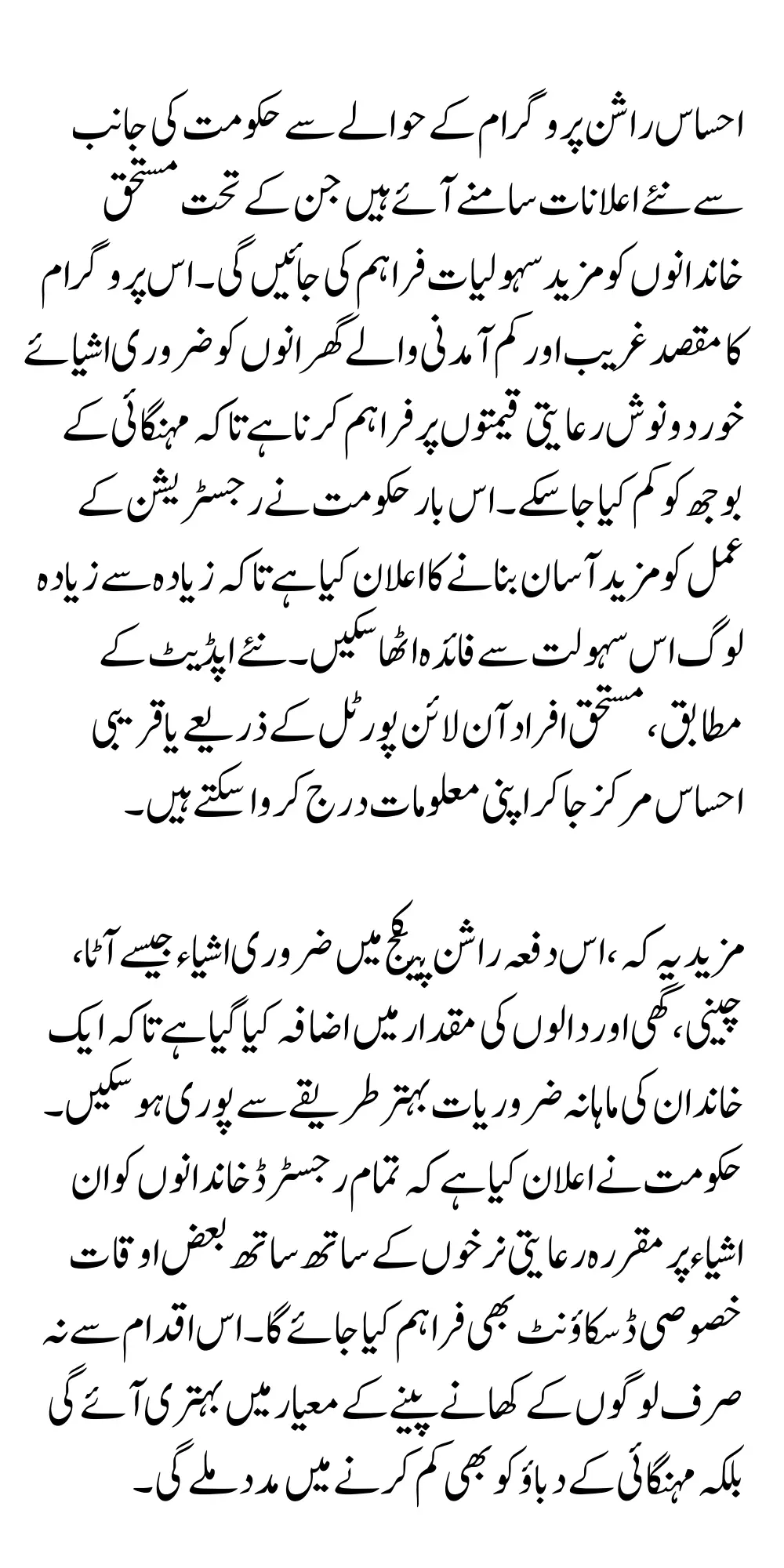 The government has made new announcements regarding the Ehsaas Ration Program, under which more facilities will be provided to the deserving families the aim of this program is to provide essential food items to the poor and low-income families at subsidized prices to reduce the burden of inflation. This time, the government has announced to make the registration process more easy so that more people can benefit from this facility According to the new update, deserving people can register their information through the online portal or by visiting the nearest Ehsaas Markaz.