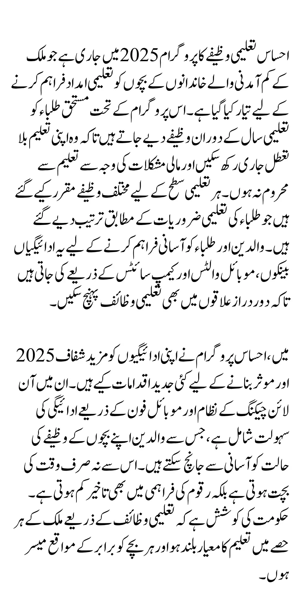 In 2025, the Ehsaas Program has taken several innovative steps to make its payments more transparent and efficient These include an online checking system and payment facility through mobile phones, which allows parents to easily check the status of their children’s scholarships. This not only saves time but also reduces delays in the disbursement of funds the government is trying to raise the standard of education in every part of the country through taleemi wazaif and ensure equal opportunities for every child.