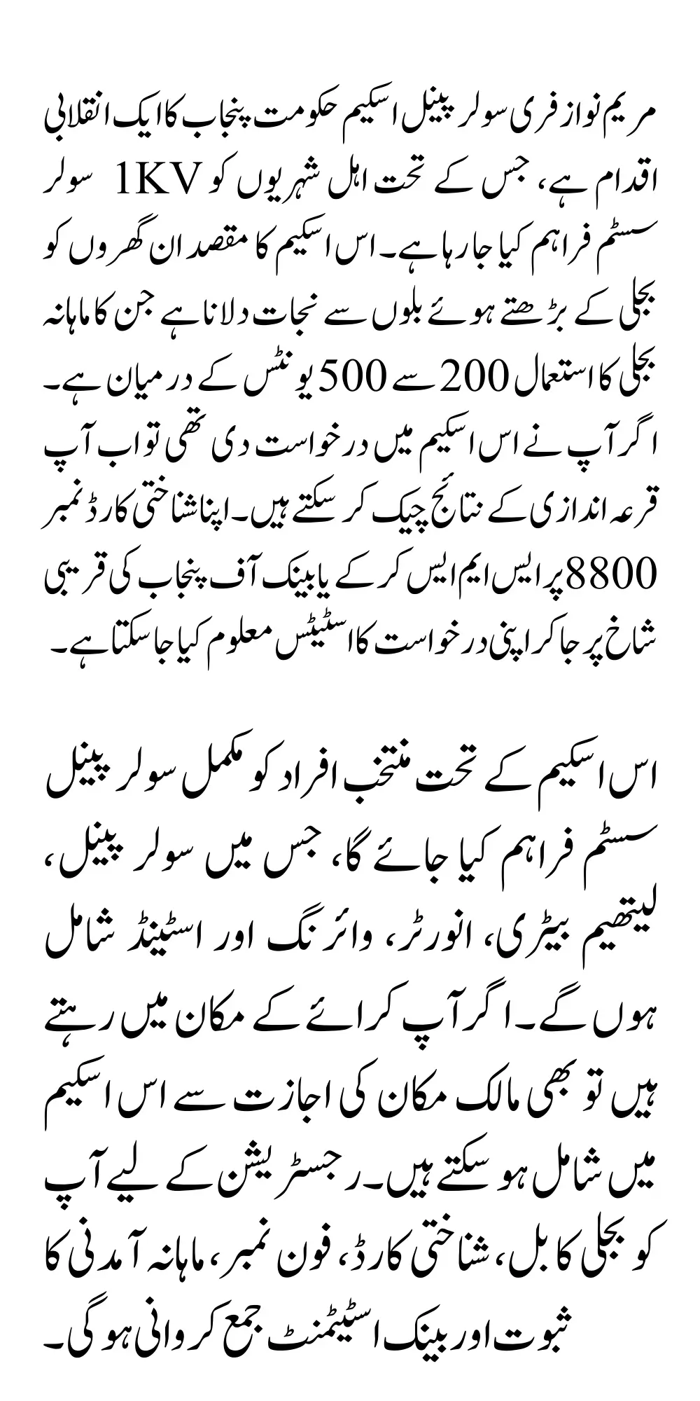 Maryam Nawaz Free Solar Panel Scheme is a revolutionary initiative of the Punjab government under which 1KV solar systems are being provided to eligible citizens the aim of this scheme is to relieve those households whose monthly electricity consumption is between 200 and 500 units from the rising electricity bills If you had applied for this scheme you can now check the results of the draw you can check the status of your application by sending an SMS to your CNIC number on 8800 or by visiting the nearest branch of Bank of Punjab.
