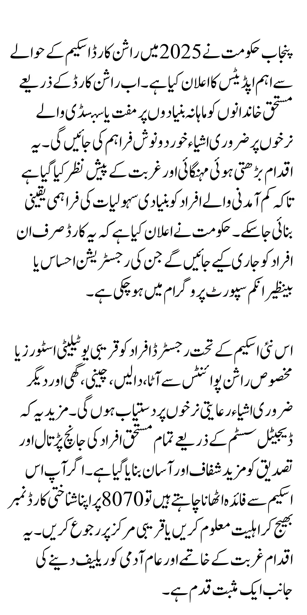 Under this new scheme, registered people will be able to get flour, pulses, sugar, ghee and other essential items at subsidized rates from nearby utility stores or designated ration points. Moreover, the verification and verification of all deserving people has been made more transparent and easy through the digital system If you want to benefit from this scheme, then send your CNIC number to 8070 to find out your eligibility or visit the nearest center. This step is a positive step towards eradicating poverty and providing relief to the common man.