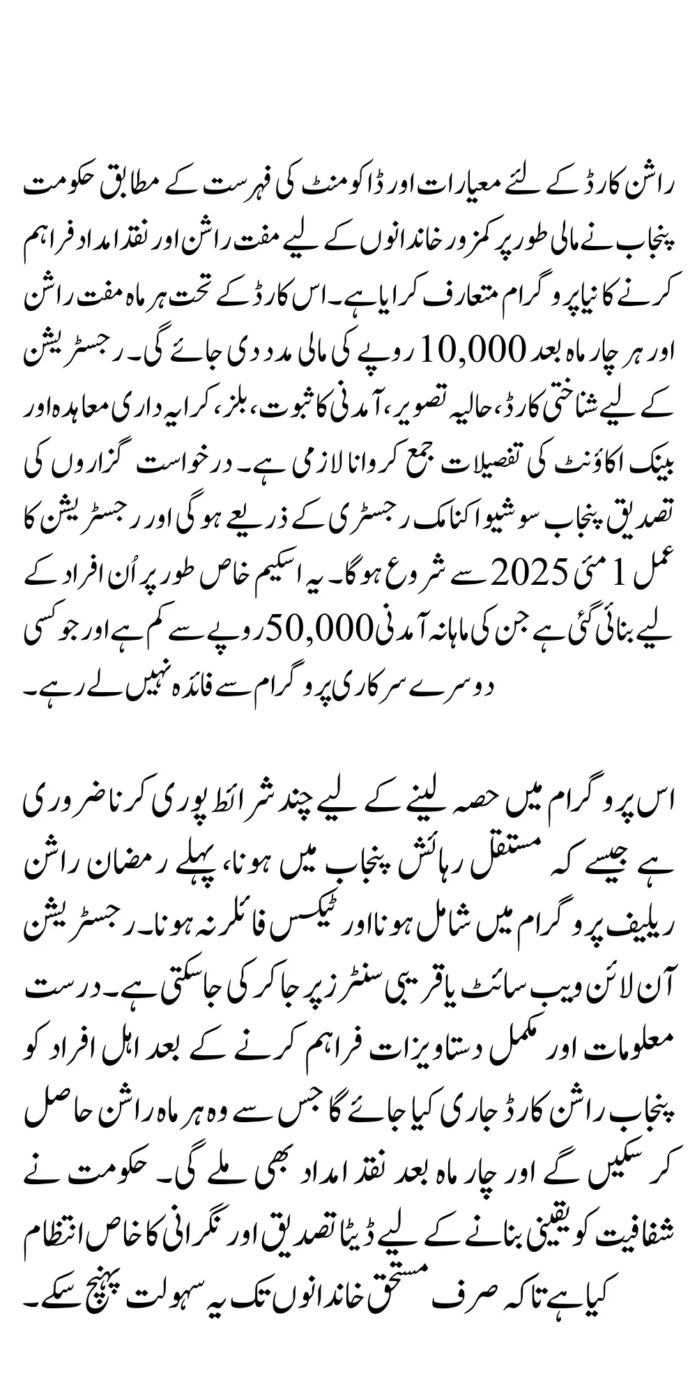 راشن کارڈ کے لئے معیارات اور دوکمنٹس کی فہرست حکومت پنجاب نے جاری کر دیے ہیں تاکہ مستحق افراد آسانی سے امداد حاصل کر سکیں۔ اس پروگرام کے تحت ہر مہینے مفت راشن اور ہر چار مہینے بعد 10,000 روپے مالی مدد فراہم کی جائے گی۔ درخواست دینے کے لیے شناختی کارڈ، حالیہ تصویر، آمدنی کا ثبوت، یوٹیلیٹی بلز، کرایہ داری معاہدہ ، اور بینک اکاؤنٹ کی تفصیلات لازمی ہیں۔ رجسٹریشن آن لائن ویب سائٹ یا قریبی رجسٹریشن مراکز پر جا کر کی جا سکتی ہے، اور درخواست کی تصدیق پنجاب سوشیو اکنامک رجسٹری کے ذریعے ہوگی۔
