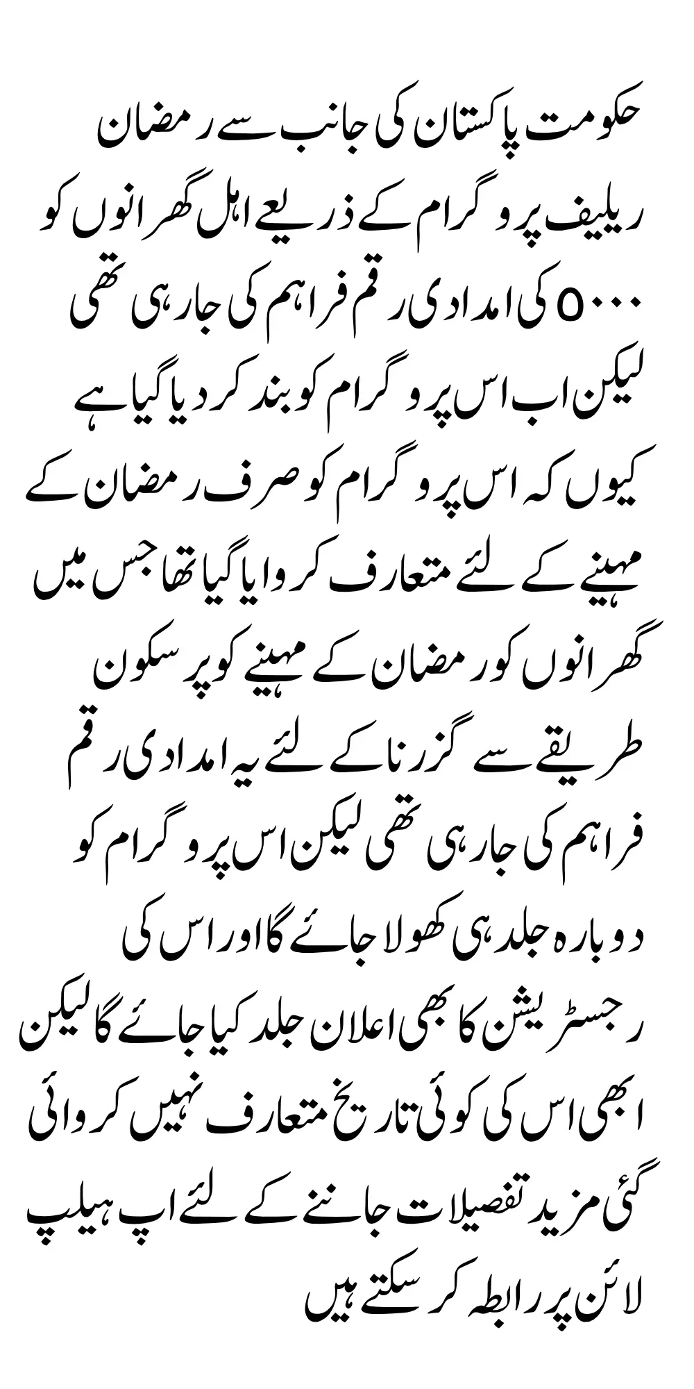 The Government of Pakistan was providing a financial assistance of Rs 5000 to eligible families through the Ramadan Relief Program but now this program has been closed because this program was introduced only for the month of Ramadan in which this financial assistance was being provided to families to spend the month of Ramadan peacefully but this program will be reopened soon and its registration will also be announced soon but no date has been introduced yet For more details you can contact the helpline.