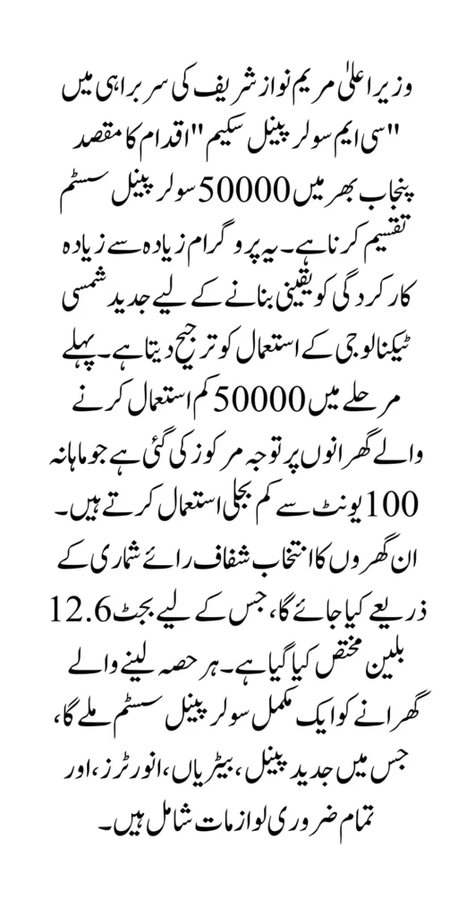 Solar Panel Scheme Registration The CM Solar Panel Scheme initiative headed by Chief Minister Maryam Nawaz Sharif aims to distribute 50,000 solar panel systems across Punjab. The program prioritizes the use of advanced solar technology to ensure maximum efficiency.