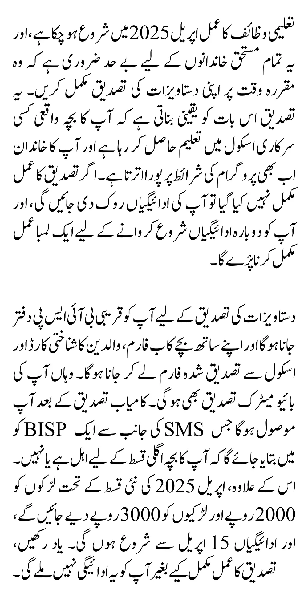 Make sure your documents are complete, accurate, and up to date. Don’t wait until the last moment—visit your nearest BISP office as early as possible in April 2025. Completing this process ensures that you will continue receiving the financial assistance that helps secure your child’s education and future.